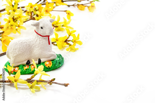 Wielkanocne tło - baranek na tle żółtych kwiatów forsycji