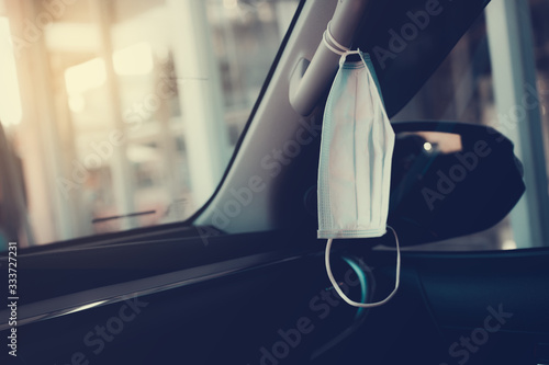 Hygienic masks hanging on the Handle hold on the inside of the car, where the sunlight comes in.protection from corona virus or COVID-19 concept.