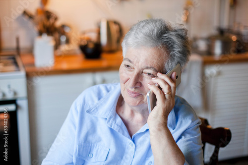 Senior woman talking on mobile phone at home kitchen. Telephone call from family to retired person. Pensioner in social distancing, isolation. People connection, communication. Lifestyle moment.
