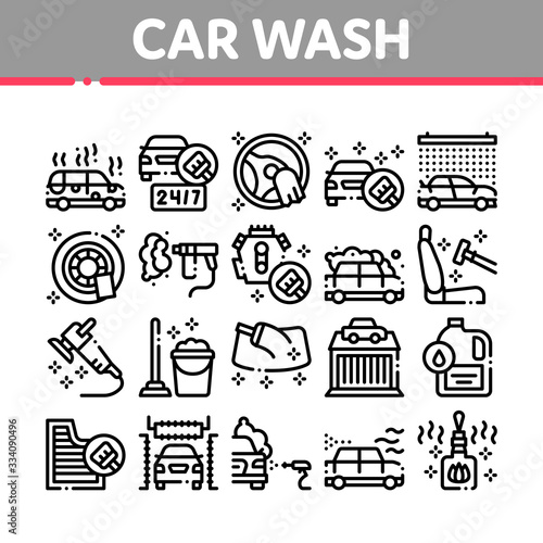 Car Wash Auto Service Collection Icons Set Vector. Automatical Car Wash Building And Equipment, Cleaning Liquid Bottle And Air Freshener Concept Linear Pictograms. Monochrome Contour Illustrations
