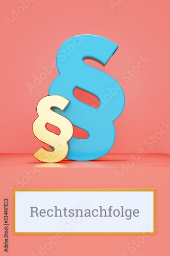 Rechtsnachfolge. Wort auf Schild. Präsentation von Paragrafen auf Podest in Museum. Symbol für Recht, Gesetz, Urteil. Rosa Hintergrund
