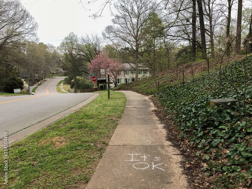 An encouraging message of It's Okay written on the sidewalk of a deserted neighborhood during quarantine for the COVID-19 pandemic