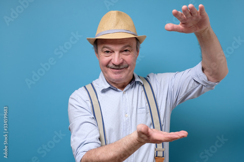 Senior happy crazy man in summer hat showing big size gesture with hands