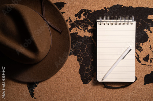 Zdjęcie kapelusza i notesu z długopisem na tle mapy świata