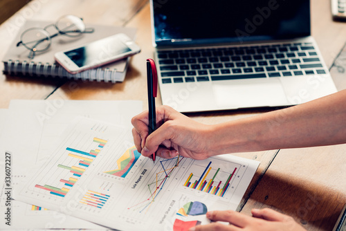 Lifestyle freelance woman and laptop computer he examined the graph profit docume