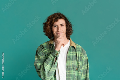 Joyful teenage guy smiling and touching his chin on turquouse background