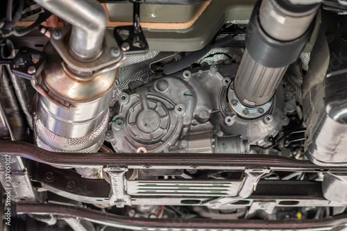 Unterboden eines Geländewagen , SUV oder Geländefahrzeugs zeigt automobile Ingenieurskunst im Detail mit Radaufhängung, Auspuff, Katalysator und Prüfung und Wartung in der KFZ-Werkstatt