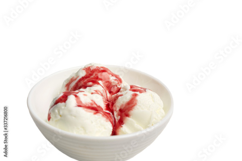 balls of white vanilla ice cream with red berry syrup in a white bowl on a white background.