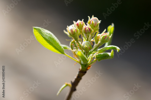 Wiosenne pąki kwiatów na gałęzi drzewa gruszy oświetlone promieniem słońca