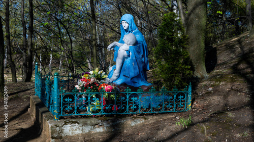 Posąg chrześcijański w parku przedstawiający Maryję trzymającą w ramionach zdjętego z krzyża Jezusa.