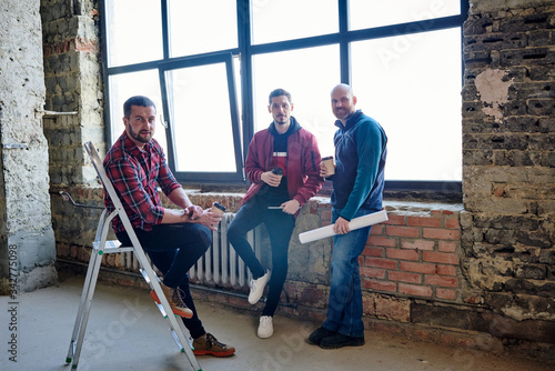 Three young engineers sitting by large window inside unfinished building