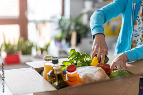 Young woman unpacking boxes of food at home