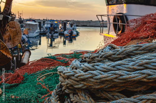 Liny i sieci rybackie w porcie w Jafie. Tel Awiw, Izrael.
