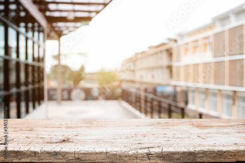 Empty wood table platform with bokeh light of city background for product presentation display montage.