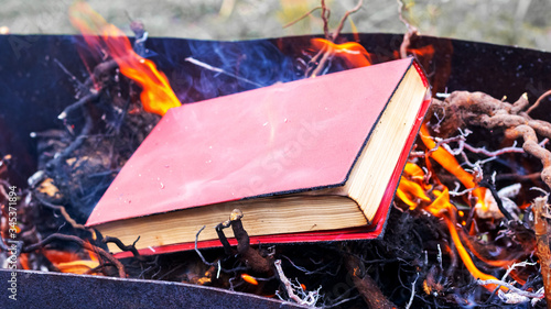 Burning books. A book on a fire. Destruction of literature