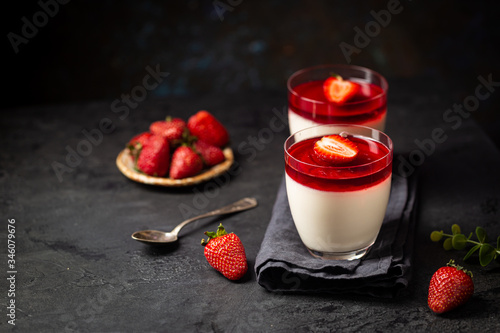 Italian panna cotta dessert with strawberry sirup and mint leaf