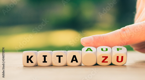 Hand dreht Würfel und ändert den Ausdruck "Kita zu" in "Kita auf".