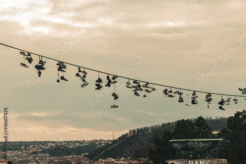 Krajobraz miejski, buty tenisówki zawieszone na przewodzie elektrycznym.