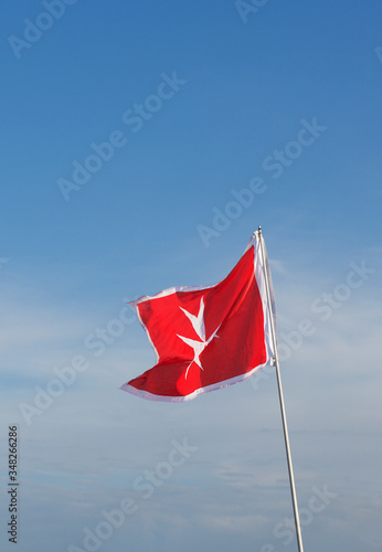 Malta flag in a wind isolated in blue sky background. Symbol of Malta - flag with cross. Europe