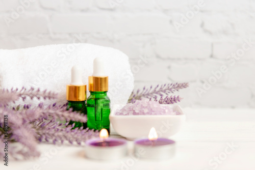 Spa beauty massage health wellness backgroundSpa Thai therapy treatment aromatherapy for body woman with lavender flower nature candle for relax and summer time. Copy space. Lifestyle Health Concept
