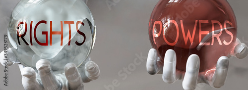 powers and rights in a balanced life - pictured as words powers,rights in hands to show that rights and powers should stay in balance, 3d illustration