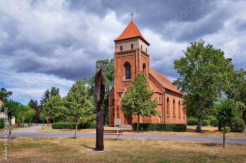 Die denkmalgeschützte neugotische Dorfkirche Bliesdorf am Radwanderweg "Tour Brandenburg"