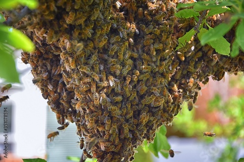 Swarm of Honey Bees, a eusocial flying insect within the genus Apis mellifera of the bee clade. Swarming Carniolan Italian honeybee on a plum tree branch in early spring in Utah. Formation of a new co