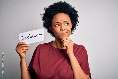 Young African American afro politician woman with curly hair socialist party member serious face thinking about question, very confused idea