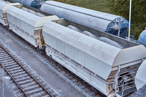 Several open freight wagon loaded with a white powder (limestone) stand on a train track.