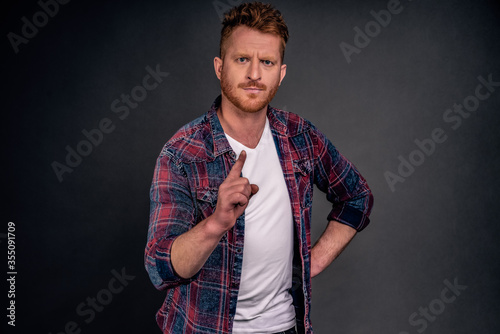 Hold on, I forbid you. Strict serious-looking young dad with ginger hair and beard waving index finger and staring displeased at camera, saying no or not, holding hand on waist, scolding child