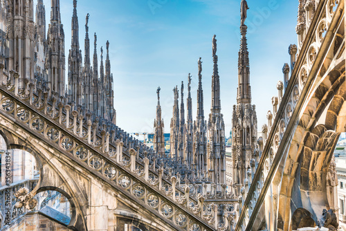Marble statues - architecture on roof of Duomo gothic cathedral in Milan