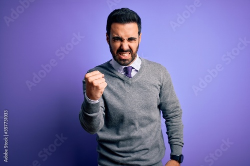 Handsome businessman with beard wearing casual tie standing over purple background angry and mad raising fist frustrated and furious while shouting with anger. Rage and aggressive concept.