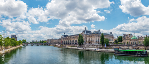 Panoramic of Musee d'Orsay, Hotel de Salm and Seine river with Notre Dame and Institut de France in the Background - Paris, France