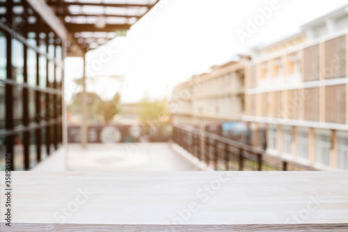 Empty wooden table space platform and Department Store of Shopping Mall background for product display montage.