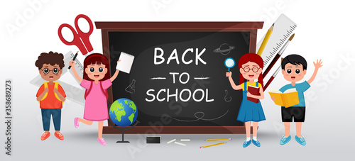 Back to school vector illustration with school kids, chalkboard, stationery, school items and elements