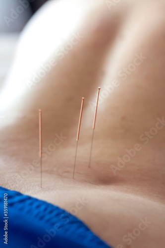 A man is being treated with acupuncture on his back. The acupuncture procedure. Back treatment.