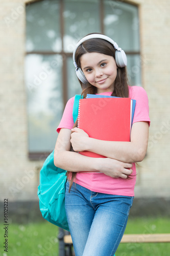 Online world. School pupil wear headphones outdoors. Learning music online. Language learning. Listening comprehension. Online courses. Online education and e-learning. New technology. Modern life