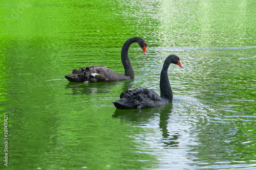 Black swans on the lake with green water. Amazing peacefull waterbird. Beautiful dark grey color of feathers.