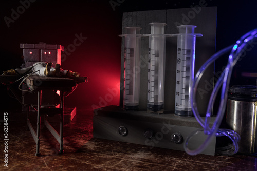 Prisoner handcuffed to death by lethal injection, vial with sodium thiopental and syringe on top of a table, conceptual image