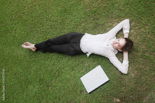 Businesswoman lying on the field with laptop beside her