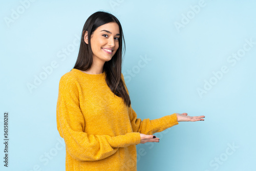 Young caucasian woman isolated on blue background extending hands to the side for inviting to come