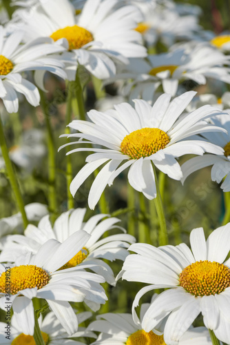 White flowers (Leucanthemum vulgare Lam., ox-eye) in the meadow