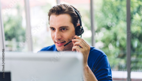 Happy call center smiling businessman operator customer support consult phone services agen working with wireless headset microphone and computer at call center office