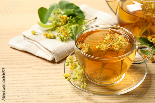 Cup of tea with linden blossom on wooden table