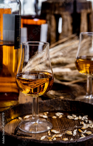 Tasting glasses with aged Scotch whisky or bourbon on old dark wooden vintage table with barley grains