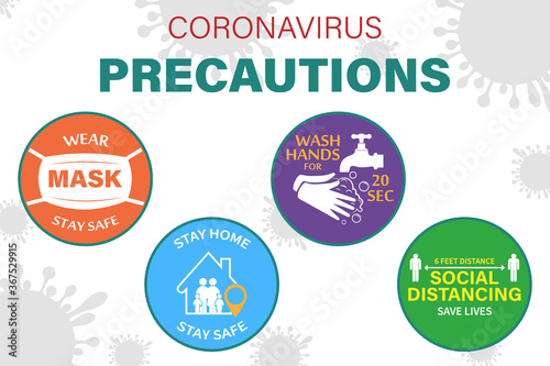 Prevention of coronaviruses.. Protection from COVID-19. For a set of colored stickers, put on a mask, wash your hands, stay at home, communicate at a distance. Illustration for a poster, banner