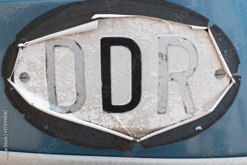 Alter DDR - Heckaufkleber an einem Fahrzeug, bei das das D hervorgehoben ist.