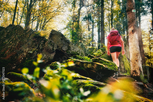 Junge Frau beim wandern mit Rucksack im bayerischen Wald