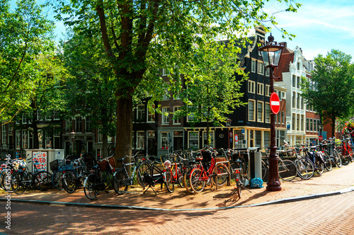 Beautiful summer sunrise, heritage canals of Amsterdam, The Netherlands, with vibrant flowers and bicycles on a bridge. June 2019