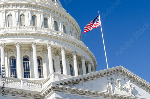 United States Capitol Building dome detail and waving U.S. National flag - Washington D.C. United States of America